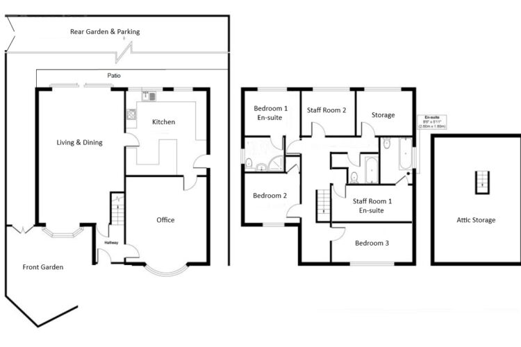 3 children`s bedrooms (1 en-suite), 2 staff bedrooms (1 en-suite), storage, communal bathroom