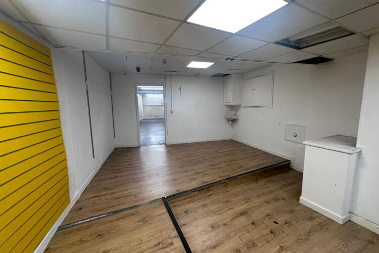 Open plan retail, kitchen, storage, office, wc