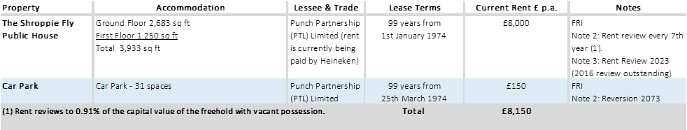 The public house and car park are at present let to Punch Partnership (PTL) Limited for a term of 99 years from 1st January 1974 at a current rent of £8,000 per annum and the lease contains full repairing and insuring covenants. The lease provides for rent review every seventh year on the public house and the next review is in 2023. The 2016 review is outstanding. Rent reviews to 0.91% of the capital value of the freehold with vacant possession.