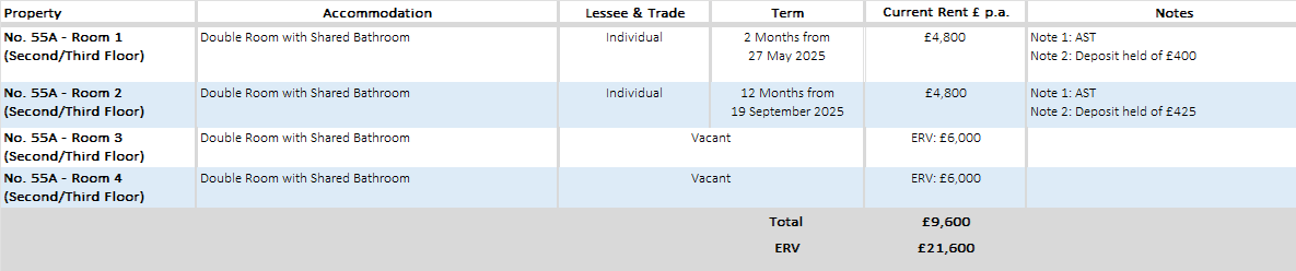 Room 1 is at present let on AST to an Individual for a term of 2 Months from 27th May 2025 at a current rent of £4,800 p.a. Deposit held of £400.