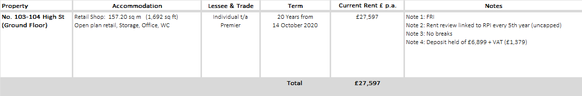 The property is at present let to an Individual t/a Premier for a term of 20 years from 14th October 2020 at a current rent of £27,597 p.a. and the lease contains full repairing and insuring covenants. Uncapped rent reviews linked to RPI every 5th Year. No breaks. Rent deposit held of £6,899 + VAT (£1,379).