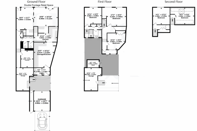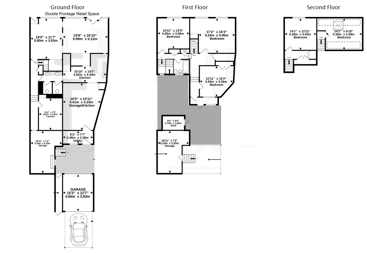 Comprises double-fronted commercial/retail space on the ground floor with a bar area, a serving counter, and to the rear of this, a commercial kitchen with storage and access to the courtyard, garage and parking space and rear access through a shared ginnel. There are two storage rooms accessed separately from the courtyard. The customer washrooms and laundry area are located at the rear of the ground floor. The residential accommodation is located on the first and second floors, with access from the ground floor it comprises three double bedrooms, a bathroom and storage on the first floor, as well as a lobby exit to the flat roof to the rear. The second floor comprises a further two bedrooms and storage areas.