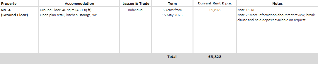 The property is at present let to an Individual for a term of 5 Years from 15th May 2023 at a current rent of £9,828 p.a. and the lease contains full repairing and insuring covenants. More information about rent review, break clause and held deposit available on request.
