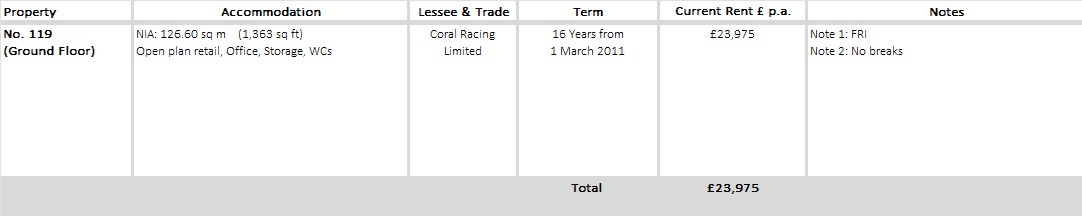 The property is at present let to Coral Racing Limited for a term of 16 years from 1st March 2011 at a current rent of £23,975.67 p.a. and the lease contains full repairing and insuring covenants. No breaks.