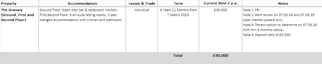 The property is at present let to an Individual for a term of 6 Years 11 Months from 7th March 2023 at a current rent of £30,000 per annum and the lease contains full repairing and insuring covenants. Rent review on 07.03.26 and 07.03.29 open market upward only. Tenant option to determine on 07.03.26 with min 6 months notice. Deposit held of £5,500.