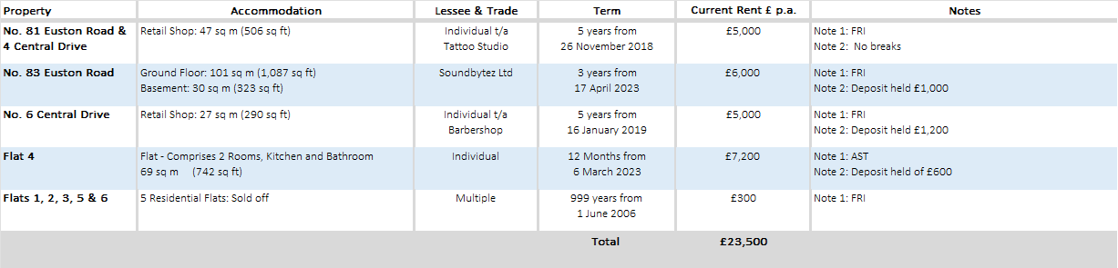 Shop No. 6 is at present let to an Individual t/a Barbershop for a term of 5 years from 16th January 2019 at a current rent of £5,000 per annum and the lease contains full repairing and insuring covenants. Rent deposit held of £1,200.