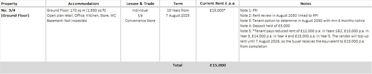 Ground floor shop is at present let to an Individual t/a Convenience Store for a term of 10 Years from 7th August 2025 at a current rent of £15,000* p.a. and the lease contains full repairing and insuring covenants. Rent review in August 2030 linked to RPI. Tenant option to determine in August 2030 with min 6 months notice. Deposit held of £3,000.