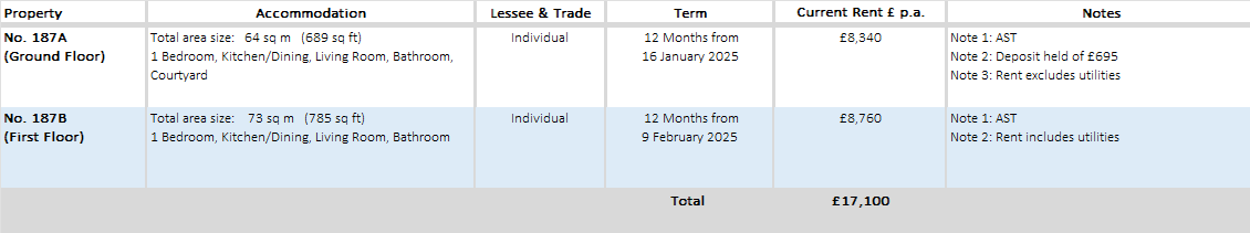 Flat 187A is at present let on AST to an Individual for a term of 12 months from 16th January 2025 at a current rent of £8,340 p.a. (excl. Utilities). Deposit held of £695.