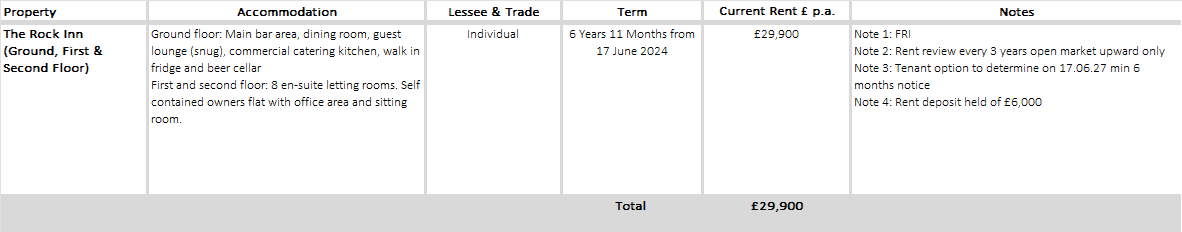The property is at present let to Slater & Slater Pubs Co Ltd for a term of 6 years 11 months from 17th June 2024 at a current rent of £29,900 p.a. Rent review every 3rd year open market upward only. Tenant option to determine on 17.06.27 min 6 months notice. Deposit held of £6,000.